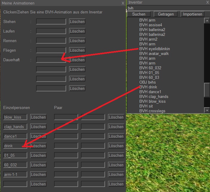 Füllen Sie die Felder auf der Seite Meine Animationen aus, indem Sie auf die BVHs klicken, sie aus Ihrem Inventar ziehen und dann die Maustaste loslassen.