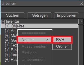 Um eine neue Animation zu erstellen, öffnen Sie Ihr Inventar, klicken Sie mit der rechten Maustaste und wählen Sie das Menü Neuer > BVH
