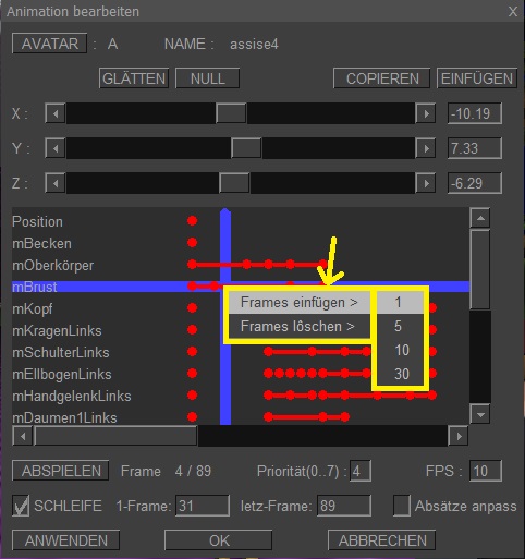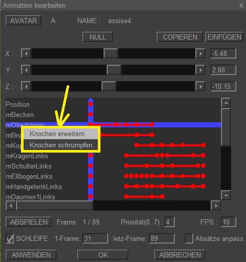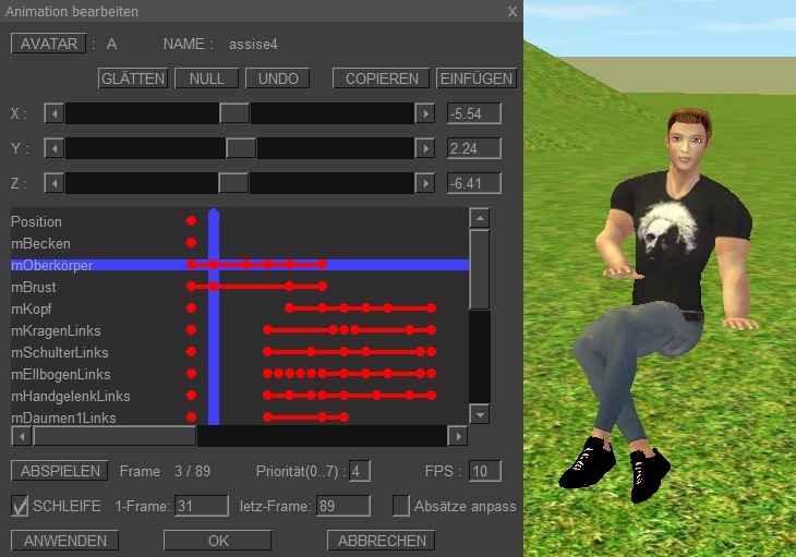 - ABSPIELEN : die Animation auf dem Avatar abspielen