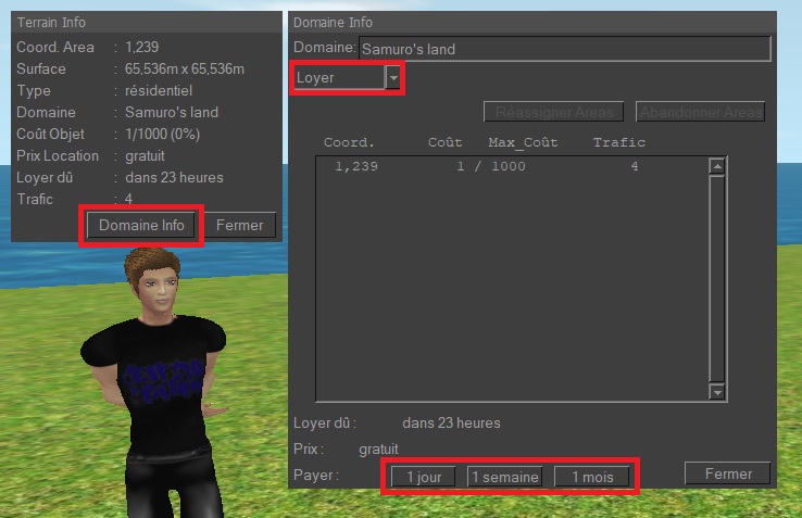 Pour prolonger votre terrain (jusqu'à 99 jours), cliquez sur le terrain et choisissez le menu TERRAIN > INFO. Cliquez DOMAINE INFO. Changez INFO en LOYER. Cliquez sur JOUR, SEMAINE ou MOIS pour prolonger. Attention si votre loyer expire, votre terrain sera effacé avec vos constructions.