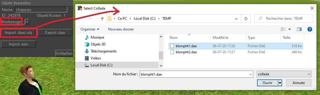 Geben Sie einen Objektnamen ein, gehen Sie zur TabSeite WERKZEUGE und klicken Sie auf IMPORT .dae/.obj.