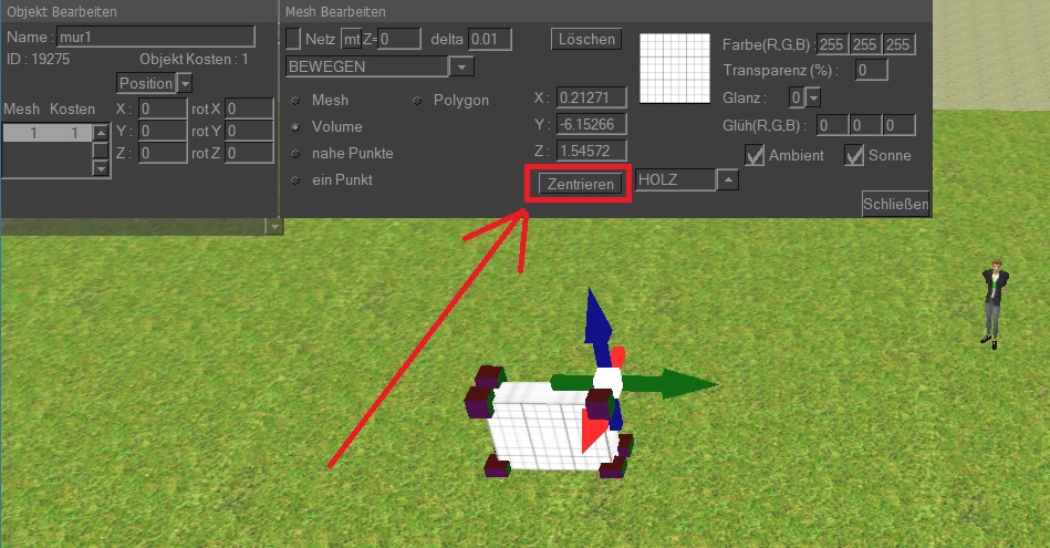 Um zu zentrieren, bearbeiten Sie das Mesh im Modus BEWEGEN, klicken Sie auf einen beliebigen Punkt des Objekts, klicken Sie dann auf den Button Zentrieren.