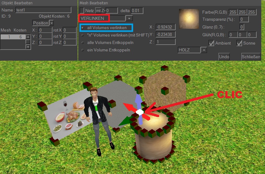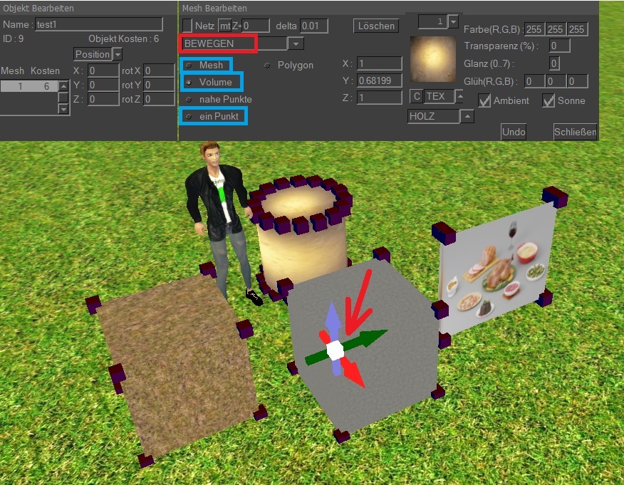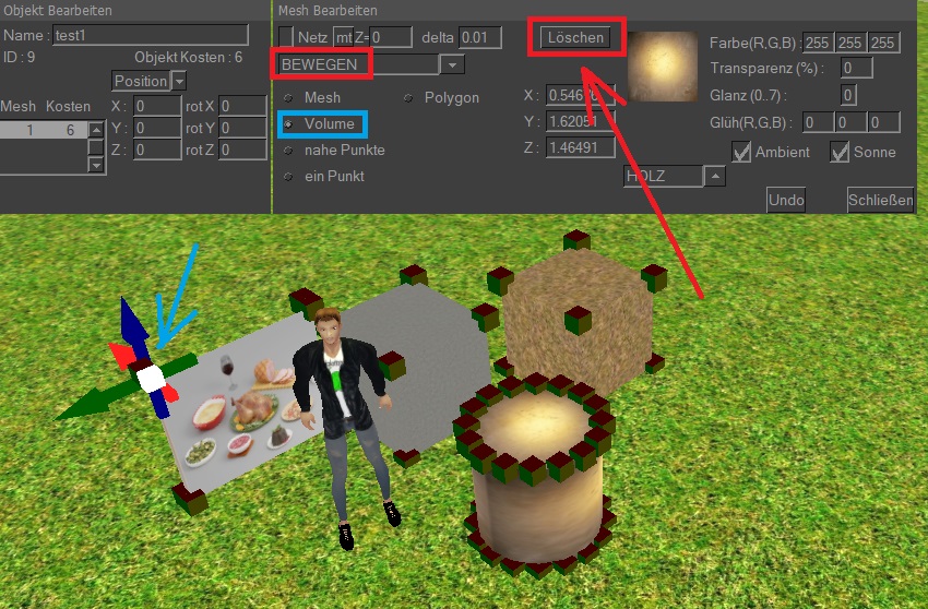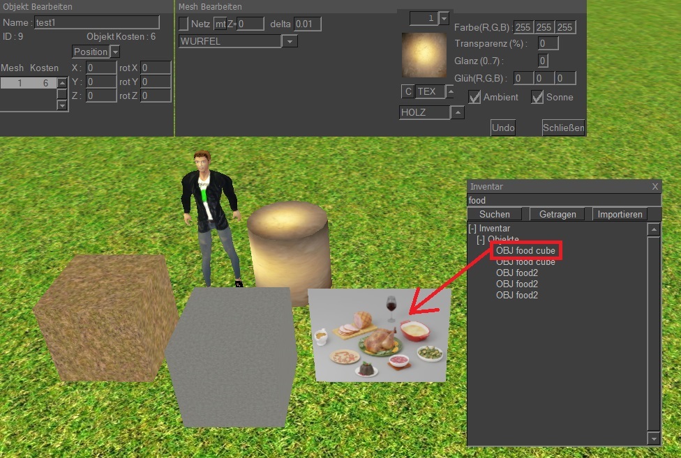 Lassen Sie das Fenster EDIT MESH immer geöffnet und ziehen Sie Gegenstände aus Ihrem Inventar in die Welt: Sie werden dann Ihrem Mesh hinzugefügt.