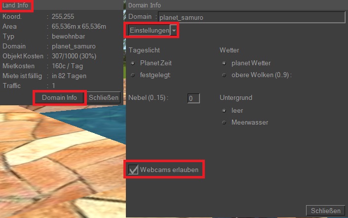 Der Landbesitzer muss Webcams und Mikrophone im Menü Domain Info zulassen.